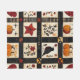This blanket showcases a rustic quilt-inspired pattern arranged in squares and rectangular blocks with warm autumn motifs. The patchwork features pumpkins, a black bird with a reddish breast, hearts, red stars, and floral branches in earthy shades of red, orange, and brown. Geometric accents like plaid and cross-stitch textures add to the handmade feel. With a cosy farmhouse aesthetic in black, cream, and fall tones, this pattern is perfect for autumn décor, primitive country style, and rustic harvest season charm.