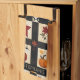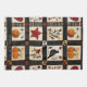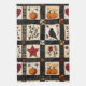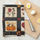 This kitchen towel showcases a rustic quilt-inspired pattern arranged in squares and rectangular blocks with warm autumn motifs. The patchwork features pumpkins, a black bird with a reddish breast, hearts, red stars, and floral branches in earthy shades of red, orange, and brown. Geometric accents like plaid and cross-stitch textures add to the handmade feel. With a cosy farmhouse aesthetic in black, cream, and fall tones, this pattern is perfect for autumn décor, primitive country style, and rustic harvest season charm.