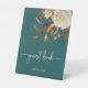 Rustic Fall Teal Pedestal Sign. Encourage guests to leave a note of love and memories with this beautifully coordinated guest book tabletop sign. Designed with a rich teal background and adorned with hand-painted watercolor artwork featuring burnt orange and terracotta leaves, cream and beige dahlias, and coppery roses, it complements your fall wedding décor with ease. Elegant and compact, it adds a warm, seasonal touch to your guest book station. Personalise the message and invite guests to share something meaningful with you.