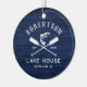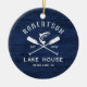 This personalised rustic family lake house photo ornament features crossed oars and a jumping fish on a rustic navy blue wood background, with family name, lake house location and established date in easy to use text templates. There is a family photo template on the back.