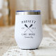 Perfect for your lakeside abode, this custom wine tumbler features your family name and "lake house" or other house type, in deep navy blue lettering. A pair of oars appears in the centre with your year established alongside.
