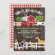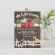 Adorable Farm Animals Birthday Party invitations. Features a Barn, pig, cows, pig, sheep, rooster, goat and baby chicks on a dark barn wood background. Great for a 2nd birthday, but any age will work.