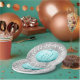 Rustic grey wood planks background, blue farmhouse pumpkin, and white wreath silhouette paper plates.