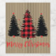 Rustic farmhouse holiday design features a trio of Evergreen tree silhouettes, one in red and black buffalo plaid, "Merry Christmas" text in festive red, and a muted vintage striped background