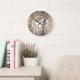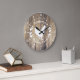 Rustic country farmhouse style clock featuring a hen in white with laurels and barn wood planks print.