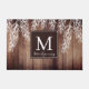 Rich brown farmhouse barn wood print doormat surrounded by a rustic white wheat stalk outlines design. Underneath the bold white monogram letter features your family's name in sweeping script.