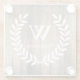 Farmhouse style white laurels and wood planks print glass coaster with personalised monogram.
