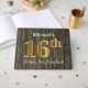 This guest book design features the ordinal number "16th" with a faux gold-like appearance. It also features a personalised name, and a rustic faux wood look background. It could be used at a party for somebody celebrating their sixteenth birthday. [~Z0000053]
