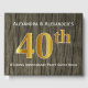 This guest book design features the ordinal number "40th" with a faux gold-like appearance. It also features custom names, and a rustic faux wood appearance background. It could be used at a party for a married couple celebrating their fortieth wedding anniversary.