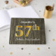 This guest book design features the ordinal number "57th" with a faux/imitation gold-like appearance. It also features a customised name, and a rustic faux wood appearance background. It could be used at a party for somebody celebrating their fifty seventh birthday. [~Z0000053]
