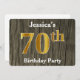 This invitation design features the ordinal number "70th" with a faux gold-like appearance. It also features a personalised name, and a rustic faux wood look background. The event details on the back can be customised. It could be used to invite people to somebody’s seventieth birthday party. [~Z0000016]