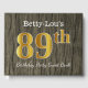This guest book design features the ordinal number "89th" with a faux/imitation gold-like appearance. It also features a personalised name, and a rustic faux wood look background. It could be used at a party for somebody celebrating their eighty ninth birthday. [~Z0000053]