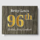 This guest book design features the ordinal number "96th" with a faux/imitation gold-like appearance. It also features a customised name, and a rustic faux wood appearance background. It could be used at a party for somebody celebrating their ninety sixth birthday. [~Z0000053]