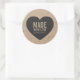 Rustic style sticker with the words "Made with Love" in bold font and a stylish script for your name or store name in brown over a grey heart against a kraft like pattern background. Use this "Handmade" sticker for labelling and packaging your handmade goods.