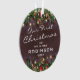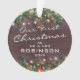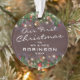 Personalised newlyweds rustic christmas ornament featuring a dark wooden background, festive christmas tree branches, red & gold tree decorations, string twinkle lights, the adorable saying 'our first christmas as mr & mrs', your name, and the year. On the reverse is a photo of their grandchild.