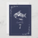 Illustration of rustic fish at top with line art botanical border. Background is navy blue colour.