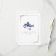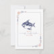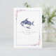 Wedding RSVP with fish illustration with botanical seashell border. Colour scheme is red and blue.