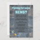 Simple fishing theme baby boy shower invitations- Gender reveal invitation reads 'Fishing for some NEWS?' in fun, baby blue lettering at the top. Personalised with future parents' names and reads 'are having a boy!' below in handwritten look lettering. Framed in rustic, greyed wood with cute bucket of fish and fishing pole in bottom corner. Introduction and shower details in black on dark grey background. Back has coordinating, solid blue background. Change background colours on either side. Use the Customise It button to change anything - font styles, sizes, colours, or placement. Cute, rustic baby boy shower party invites for casual couples shower, summer outdoor showers, and country themes. We have more baby shower paper party supplies and decor in our Zazzle.com/angela65* shop.
