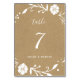 This wedding table number features a rustic floral botanical white wreath on a brown faux kraft paper background.