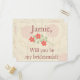 Using a rustic beige and red background, this bridesmaid proposal has her name written in lovely red font with "Will you be my bridesmaid?" underneath. Order yours today!