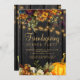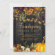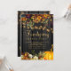 Beautiful rusty orange and dark burgundy autumn fall flowers and pumpkin borders with strings of golden twinkle lights over a dark brown barn wood background making a charming Thanksgiving friendsgiving dinner invitation with a trendy handwriting gold typography script. +++++++++ Easy to personalize with your details! Suitable for traditional rustic | country | farmhouse | outdoor backyard family and friends gatherings.