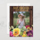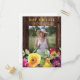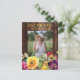 Rustic dark brown wood graduation Save the Date/Announcement postcard with colourful yellow and purple watercolor floral and space for your photo. Contact us for help with customisation or to request matching products.