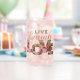 Inspirational words "Live, Laugh, Love" with love spelled out in a rustic flower pattern on glass.