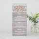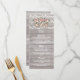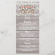 Stylish rustic menu with a light grey rustic wood background, string twinkle lights, three pink rose mason jars with burlap wrapped around them, you and your partners initials printed on the jam jars and trendy white wording.