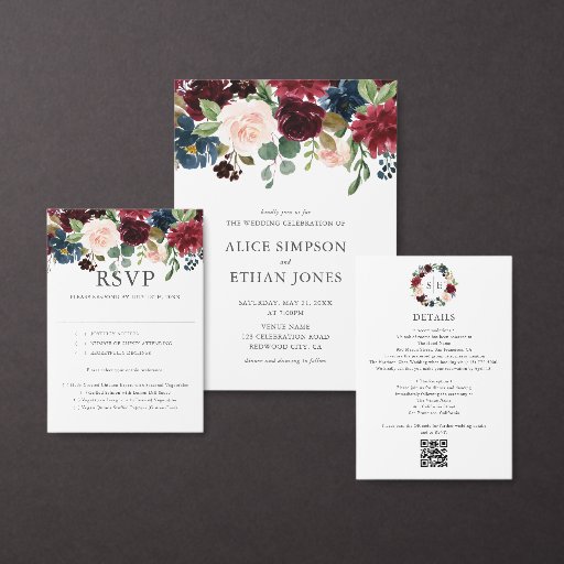 Inside, a delicate watercolor wreath of burgundy and blue flowers gracefully frames your couple’s monogram, creating a stunning focal point that exudes romance and charm. This thoughtful detail sets the stage for the beauty and love that your wedding day will embody.