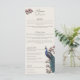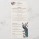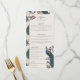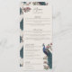 This elegant, ivory complete wedding menu features hand-drawn "Chinoiserie-style" illustrations of a blue and teal peacock bird surrounded by Magnolia greenery, showcasing vibrant cream and blush pink magnolia flowers, all against an elegant ivory background. The back features an elegant floral and bird pattern with coordinating illustrations. All text is editable. Customise with your wedding details, including bride and groom names, appetizer, main course, dessert table and drinks.