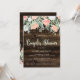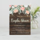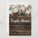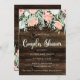 These rustic and trendy couples shower brunch invitations feature watercolor flowers and leaves in soft shades of blush pink, peach, white, and blue, with a modern accent of faux gold dots, on a brown wood look background.