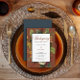 An ethereal floral bouquet in shades of winter white, gold, orange and dark red with greenery on a white, dusky gold and dark teal edged panel over a rusty orange background invites your guests to what is sure to be a memorable rustic "Thanksgiving Dinner" elegant occasion. The back features a dark teal background. Composite design by Holiday Hearts Designs (rights reserved).