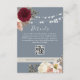 Help your guests stay informed with this elegant dusty blue wedding details card, adorned with string lights, burgundy florals, and a scannable QR code for RSVP, venue info, and more. The perfect blend of rustic charm and modern convenience.