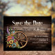 An elegant rustic wood floral wagon wheel wedding save-the-date for you to send to your friends and loved ones to announce the exciting news of your future wedding to allow them time to make arrangements to attend your special day.