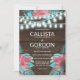 This modern and rustic wedding invitation is perfect for a trendy and stylish country event. It features hand-drawn light pink and dark pink flowers and teal green leaves overlayed on top of brown barn wood planks. It also depicts glowing mason jar hanging string lights. It's pretty, elegant, and unique; perfect for any outdoor, barn, or backyard wedding.