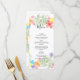 This design features a rustic floral watercolor wreath. The beautiful greenery and pink, green, purple, pink, red, orange, blue and yellow flowers combine to create a rustic elegant wreath that surrounds some of the wording text. The elegant watercolor flowers are arranged around the bride's and groom's names. The use of classy typography for the wording text compliments the design. This design is ideal for any wedding theme. The perfect menu card design for all seasons. Matching wedding invitations and other stationery items are also available.