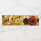 Custom wedding water bottle label features a gold foliage background and rustic oil painted burgundy earthy toned autumn fall flowers over greenery and pampas grass.