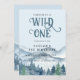 Rustic watercolor forest "wild one" theme 1st birthday party invitation with mountains and trees in hues of blue and green.