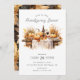 This Friendsgiving invitation features a rustic wooden table filled with pumpkins, fall flowers and wine. The invitation is simple and elegant, with a white background and black text. The rustic wooden table adds a touch of warmth and cosiness,