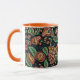 Coffee Mug in Rustic Fruit & Floral design. Shades of orange, peach, green, and blue on a black background. Orange handle and interior.