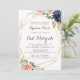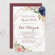 This rustic gold leaves calligraphy bat mitzvah invitation is perfect for a modern bat mitzvah. The design features hand-drawn watercolor purple, navy, blush, burgundy, navy flowers, green and gold leaves adorning an elegant geometric frame.
