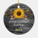 Personalise your very own large ceramic sunflower Christmas ornaments by adding your own text or personal message. The unique design on the front of these rustic Christmas ornaments depicts a large watercolor sunflower aglow with holiday string lights and accented by burgundy red holly berries with gold swirls. Love the warm country feel or modern farmhouse decor? Beneath the floral artwork is a maroon country barn wood, with options to change the colour to a vintage grey, white and also a different tartan plaid pattern. On the backside, add your own monogram initials, name or personalised text to the elegant calligraphy brush script font, and also the year. If you prefer an alternate typography style, customise the design further to uncover a vast array of creative options from fonts, to colours, and different patterns - even change the round shape into a heart, square, etc. Are you celebrating a fall/autumn or winter wedding? If sunflowers or yellow daisy flowers were part of your big day, these personalised floral holiday tree ornaments can make a meaningful keepsake of those special memories. Create your own ornaments, and have a merry Christmas! Category: sunflower ornaments; template ornaments; and vintage ornaments. Holiday colour theme: red, yellow gold, white, green and grey.