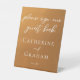 This rustic gold wedding pedestal sign features elegant white typography overlaid on an understated earth tone gradient. Simple light orange and brown hues follow the current fall trends for a bohemian wedding this autumn. Please sign our guest book. Complete the look with your minimalist script over the colour fade.