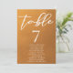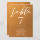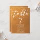 This rustic gold wedding table number card with numbers features elegant white typography overlaid on an understated earth tone gradient. Simple light orange and brown hues follow the current fall trends for a bohemian wedding this autumn. Complete the look with your minimalist script over the colour fade.