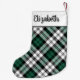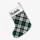 Christmas stocking features a modern personalized monogram design with a classic green and white black watch Scottish tartan plaid patterned background. Personalize the custom script text with each family member name. Includes the same design on both sides of the stocking.