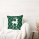 Square holiday accent pillow features a family monogram of your last name (or other text) with a rustic green and black check plaid buffalo patterned frame and white reindeer silhouette.