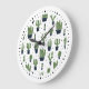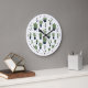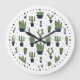 A clock with a rustic western flavor. Designed with a bunch of cute green cactuses in a repeating pattern. Specifically, green colored prickly cactus sitting in a dark blue flower pot. Little decorative triangles in between them. Whimsical fun illustration.
