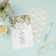 This botanical wedding menu from the Do Tell A Belle suite combines modern artistry with timeless elegance. Featuring a top boarder of watercolor hydrangeas in shades of green, white and antique with delicate botanical details, it offers a budget friendly dinner menu option that’s both stylish and affordable.