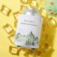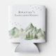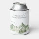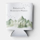 Watercolor landscape painting of trees, flying birds and montains in the background. Calm and serene nature illustration with pine trees and silhuettes of flying birds. Add names of bride and groom and the wedding date on this personalizes can cooler.