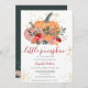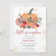 Cute dusty rose pink and orange pumpkins watercolor and red burgundy a, green, orange and dusty pink rose floral watercolor bouquet baby shower invitation with an elegant script font typography featuring a pretty fall autumn watercolor pumpkins, perfect for fall season and Halloween.